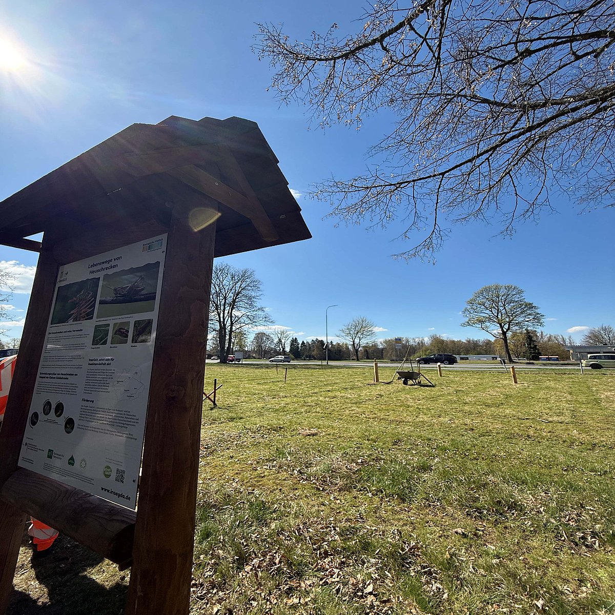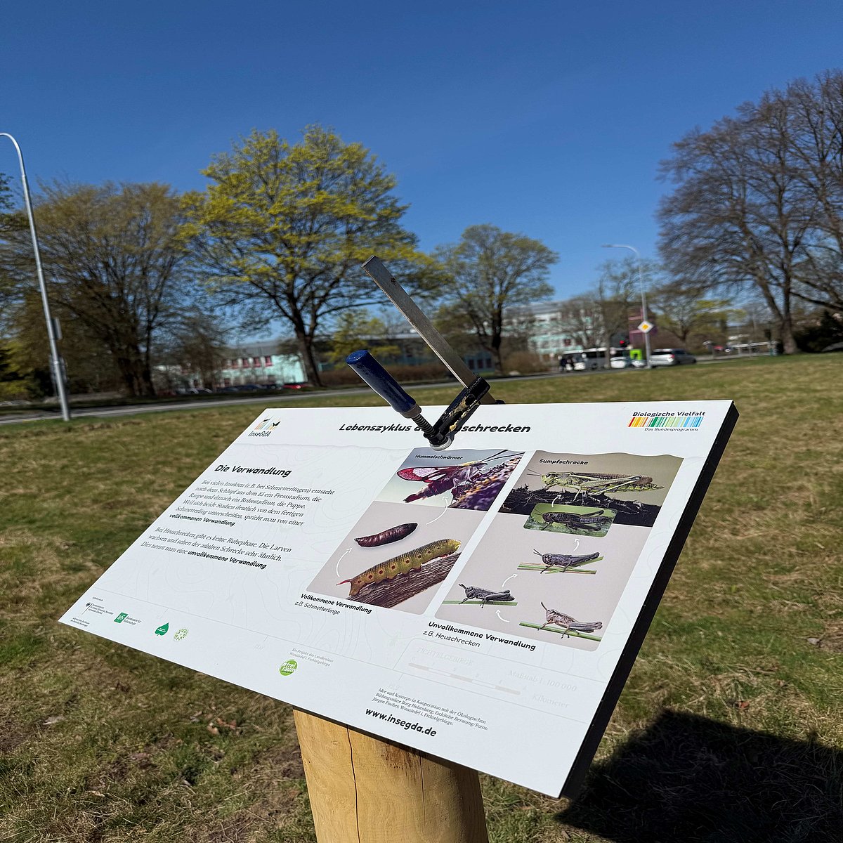Im Mittelpunkt steht die Heuschrecke: Eine zentrale Tafel erklärt ihren Lebenszyklus, entlang des Labyrinths vertiefen weitere Stationen die einzelnen Entwicklungsphasen anschaulich.