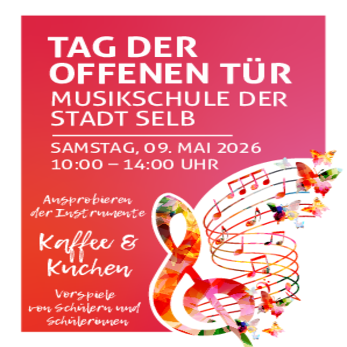 Die Musikschule der Stadt Selb freut sich darauf, am Samstag, 09.05.2026, ab 10:00 Uhr ihre Türen weit zu öffnen: die Besucher sind herzlich eingeladen, mit den Lehrkräften und den Mitarbeitern aus Verwaltung und Leitung ins Gespräch zu kommen.